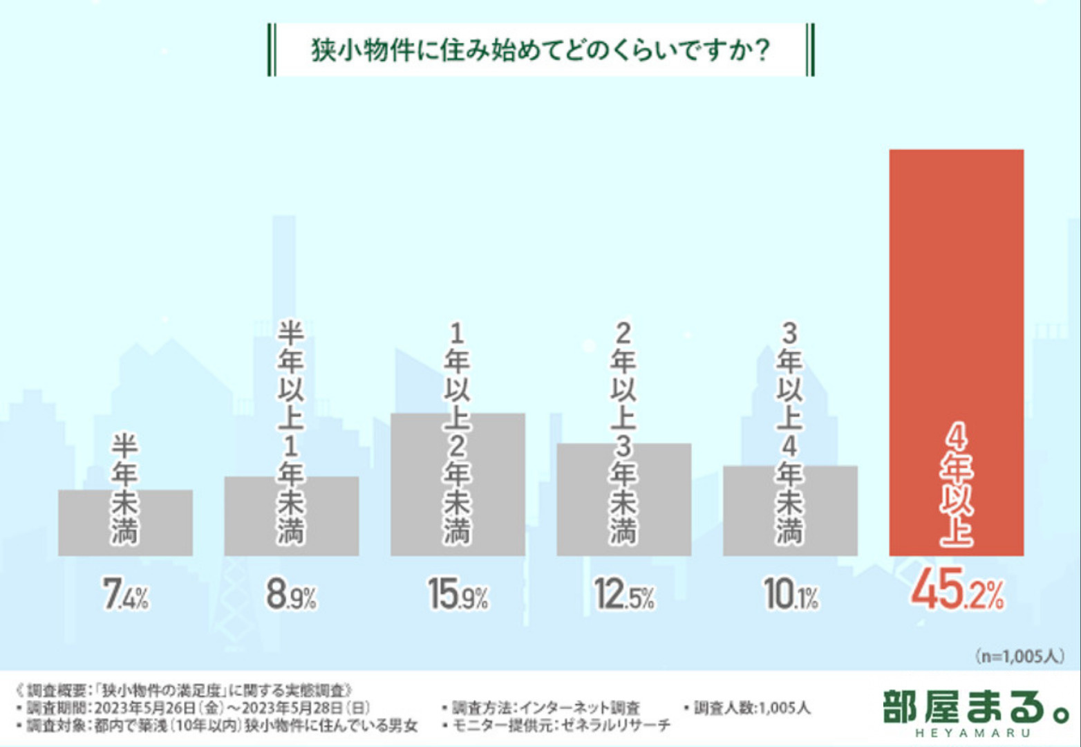 狭小物件の居住年数について伺ったところ、なんと『4年以上』が4割以上(45.2%)占める結果となりました。