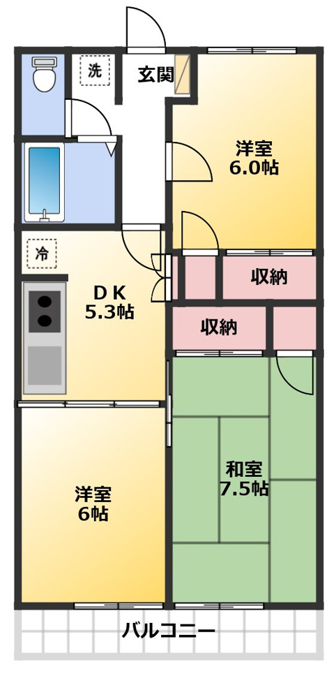 - 3DK DK 5.3畳 洋室 6.0畳 洋室 6.0畳 和室 7.5畳